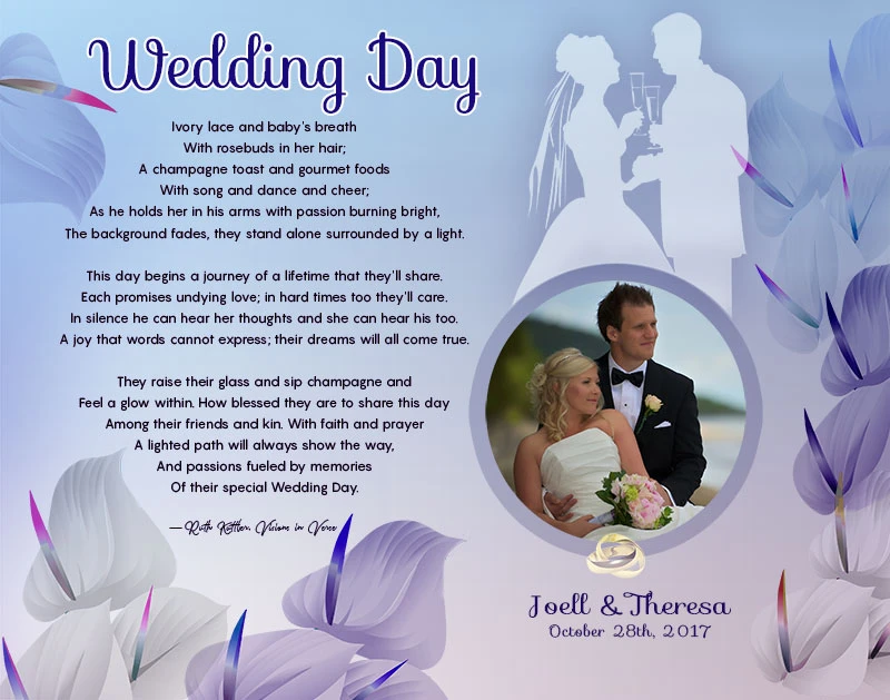 Want a personalized wedding gift idea for your special friend or loved one? This heartfelt wedding art poem personalized with a photo and an optional name and wedding date is sure to be a favorite and keepsake gift for any bride and groom. The original poem and artwork are presented in your choice of a golden lavender or blue lavender Cally Lillie design. A reading of the poem during the wedding ceremony will strengthen the meaning of their momentous event and serve as a reminder of their sacred union before friends and family. The high-resolution artwork is printed with a photo of the bride and groom that replaces the placeholder picture shown.